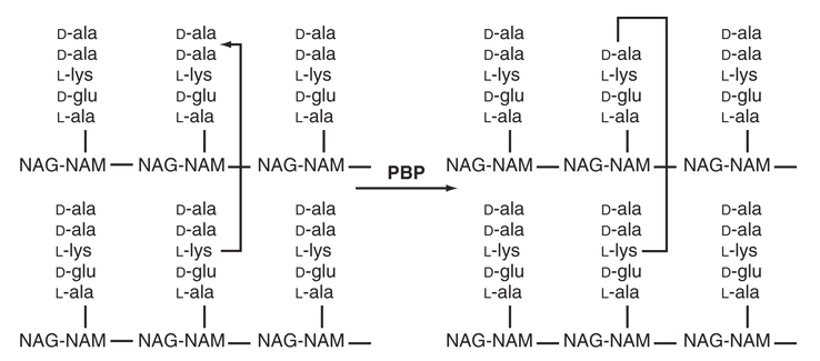 The penicillin-sensitive reactions are catalyzed by a family of closely related proteins, called penicillin-binding proteins (PBPs). Bacteria produce four types of PBPs, which structurally resemble and are likely derived from serine proteases. High-molecular-weight PBPs (i.e., >50 kilodaltons [kDa]) and low-molecular-weight PBPs catalyze transpeptidation and carboxypeptidation reactions of cell wall assembly, respectively.